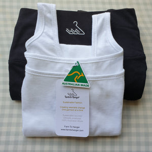 The Comfy Cami Singlet - White AND Eco Active Yoga Pants - Black  is our Special bundled offer  The beautifully soft 100% cotton Cami's are great on their own or under your favourite jacket. Made from 100% Australian grown cotton and teamed with our Eco Active Yoga Pants, perfect for a yoga class or a long walk.