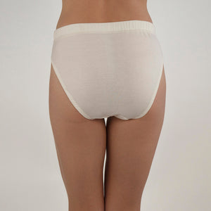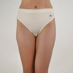 Our High Cut Comfy Bum Knickers - Five Set - Natural are beautifully flattering and endlessly wearable. These knickers sit softly at the natural waist, with a high cut leg that creates a graceful, lengthening line while still offering full coverage at the back. A style that blends comfort with a hint of allure — soft where you want it, a little playful where you love it. Made from our superfine 100% Australian grown cotton and finished with Oeko-Tex certified biodegradable elastic, they’re crafted to move with you and be loved for years to come. Every garment begins with care — for you, for those who make it, and for the earth we share.