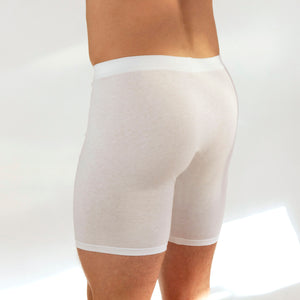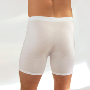 Natural support with extra coverage. Our Men's Comfy Trunks, Long Leg - White are designed for breathability and all-day comfort, with a longer leg cut that stays in place and moves easily with you. Finished with a biodegradable elastic waistband, they’re built to support you now and return safely to the earth when their time is done. Every garment begins with care — for you, for those who make it, and for the earth we share.
