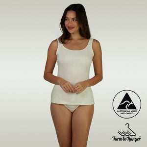 The new Comfy Cami Singlet - Natural "A Comfy Cami goes with me everywhere!" Says our Founder, Anna-Louise. These beautiful soft 100% cotton Cami's are great on their own or under your favourite jacket. Made from 100% Australian grown cotton. Great to team with any of the Bio Range Knickers for a stress free day or a comfortable night's sleep.