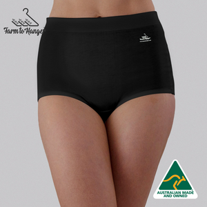 Our newest edition to the Comfy Bum Knicker range the High Waist Low Leg Comfy Bum Knickers - Single - Black offers maximum coverage, complete comfort. Designed to sit above the belly button with a low leg line, this style offers our fullest coverage without moving into a short. Crafted from our 100% Australian grown sustainable cotton and finished with Oeko-Tex certified biodegradable elastic, they keep you comfortably supported all day — so comfortable you’ll forget you’re wearing them. Every garment begins with care — for you, for those who make it, and for the earth we share.