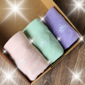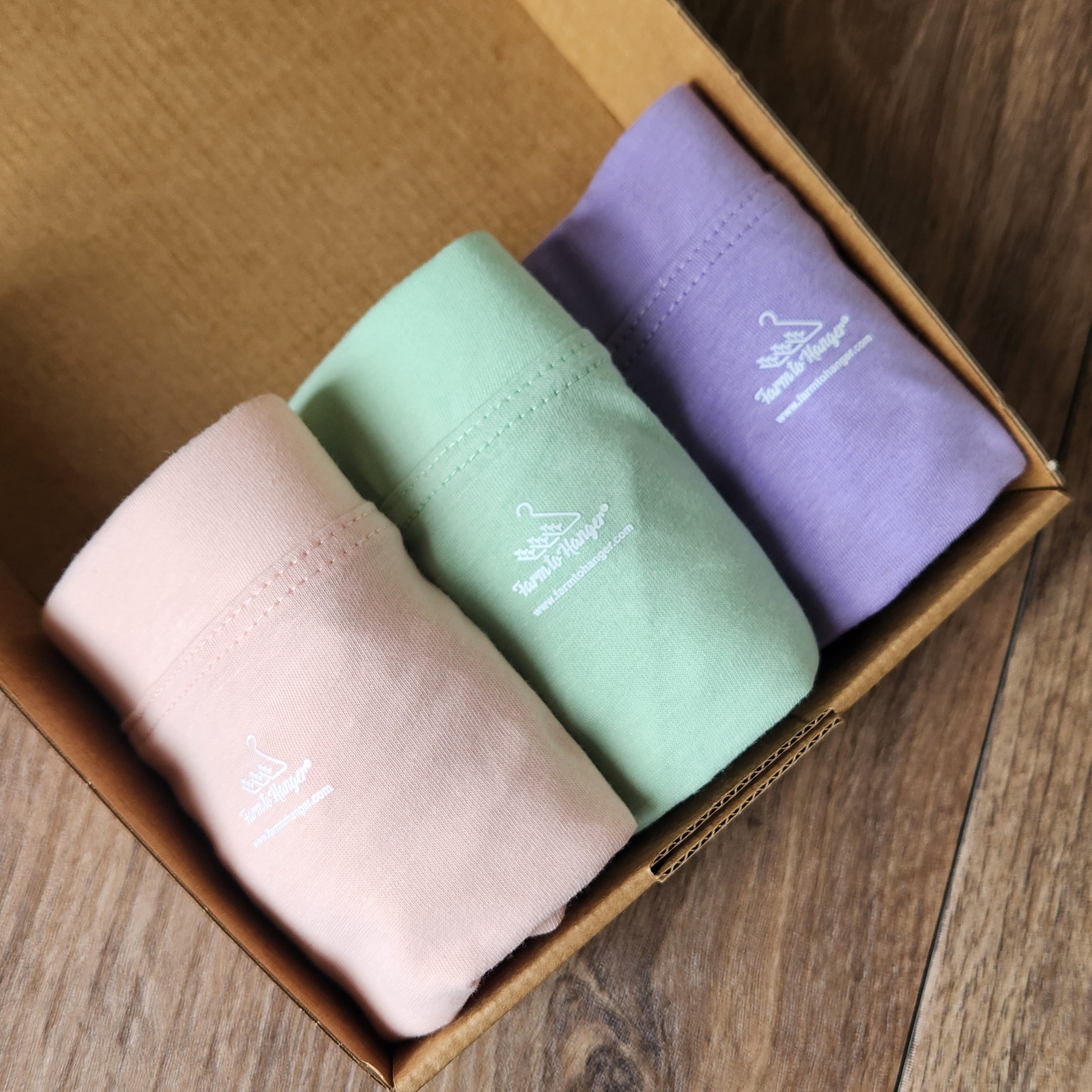 The High Cut Comfy Bum Knickers - Multi-Coloured Triple Set are for those that love a natural waist knicker with high cut legs in new 2025 Summer Colours - Ballet Pink, Apple and Lavender! - Limited Edition Only!  A very flattering cut of knickers at the front with all the coverage and comfort at the back. Made with our Superfine spun 100% cotton fabric that keeps you cool and comfortable and finished with high quality Oeko-Tex Biodegradable elastic.