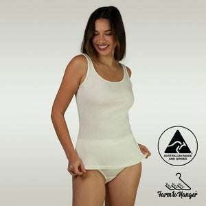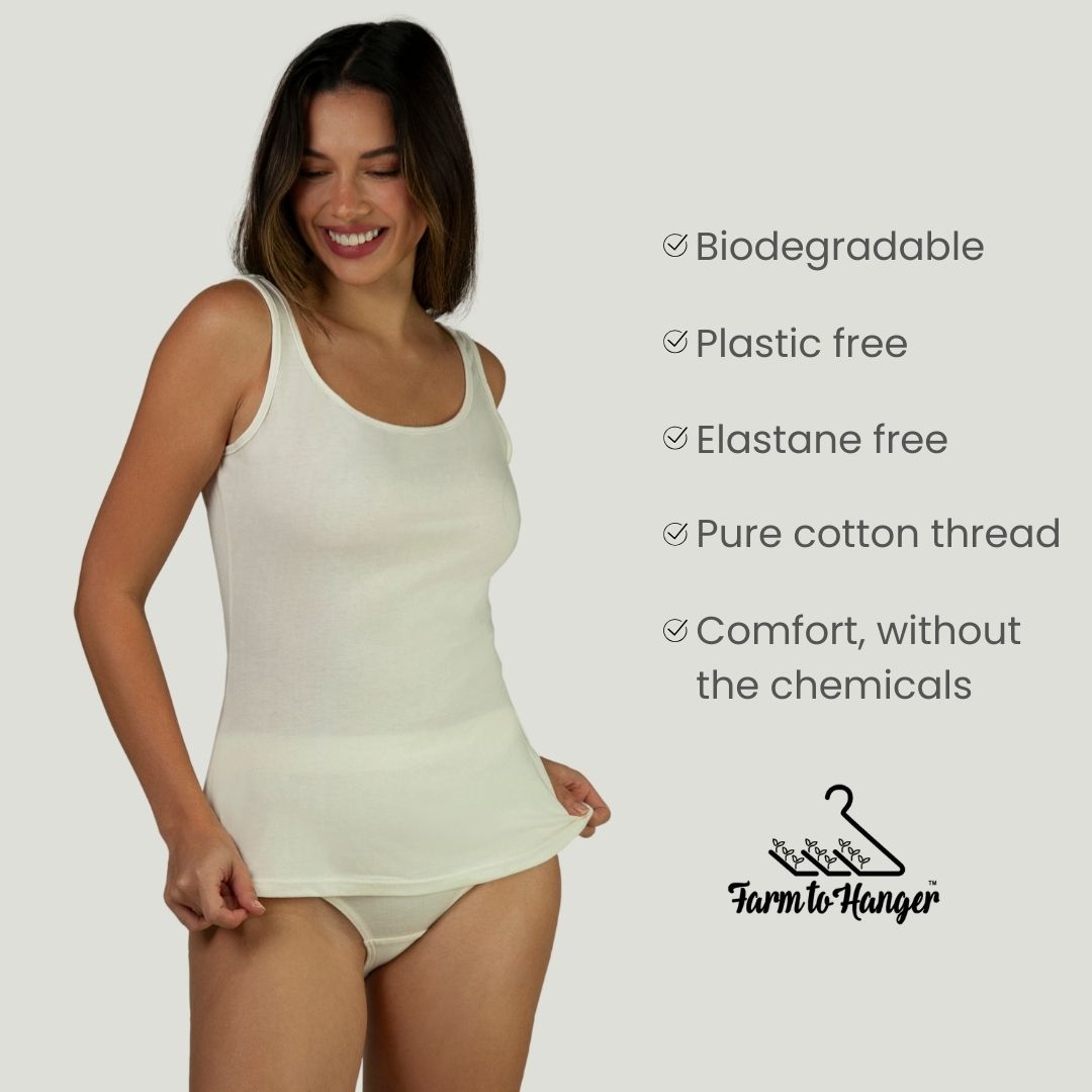 The new Comfy Cami Singlet - Natural "A Comfy Cami goes with me everywhere!" Says our Founder, Anna-Louise. These beautiful soft 100% cotton Cami's are great on their own or under your favourite jacket. Made from 100% Australian grown cotton. Great to team with any of the Bio Range Knickers for a stress free day or a comfortable night's sleep.